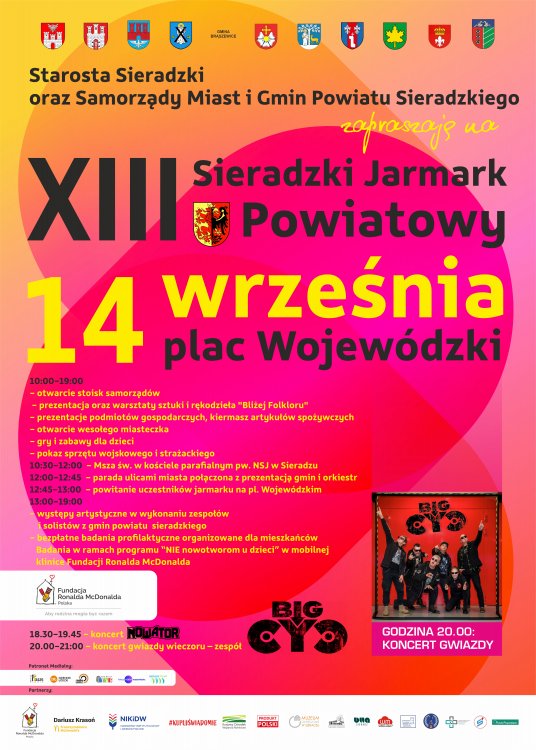 Starosta Powiatu Sieradzkiego wraz ze współorganizatorami zaprasza mieszkańców na tegoroczną edycję XIII Sieradzkiego Jarmarku Powiatowego, który odbędzie się 14 września 2025 r. (niedziela) na placu Wojewódzkim w Sieradzu w godzinach 9:00–17:00.
