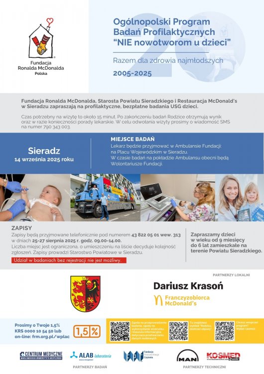 Na zaproszenie Starosty Powiatu Sieradzkiego w Sieradzu zagości Mobilny Ambulans Fundacji Ronalda McDonalda, w którym w ramach programu „NIE nowotworom u dzieci” będą prowadzone bezpłatne profilaktyczne badania USG dla dzieci w wieku od 9 miesięcy do 6 lat.